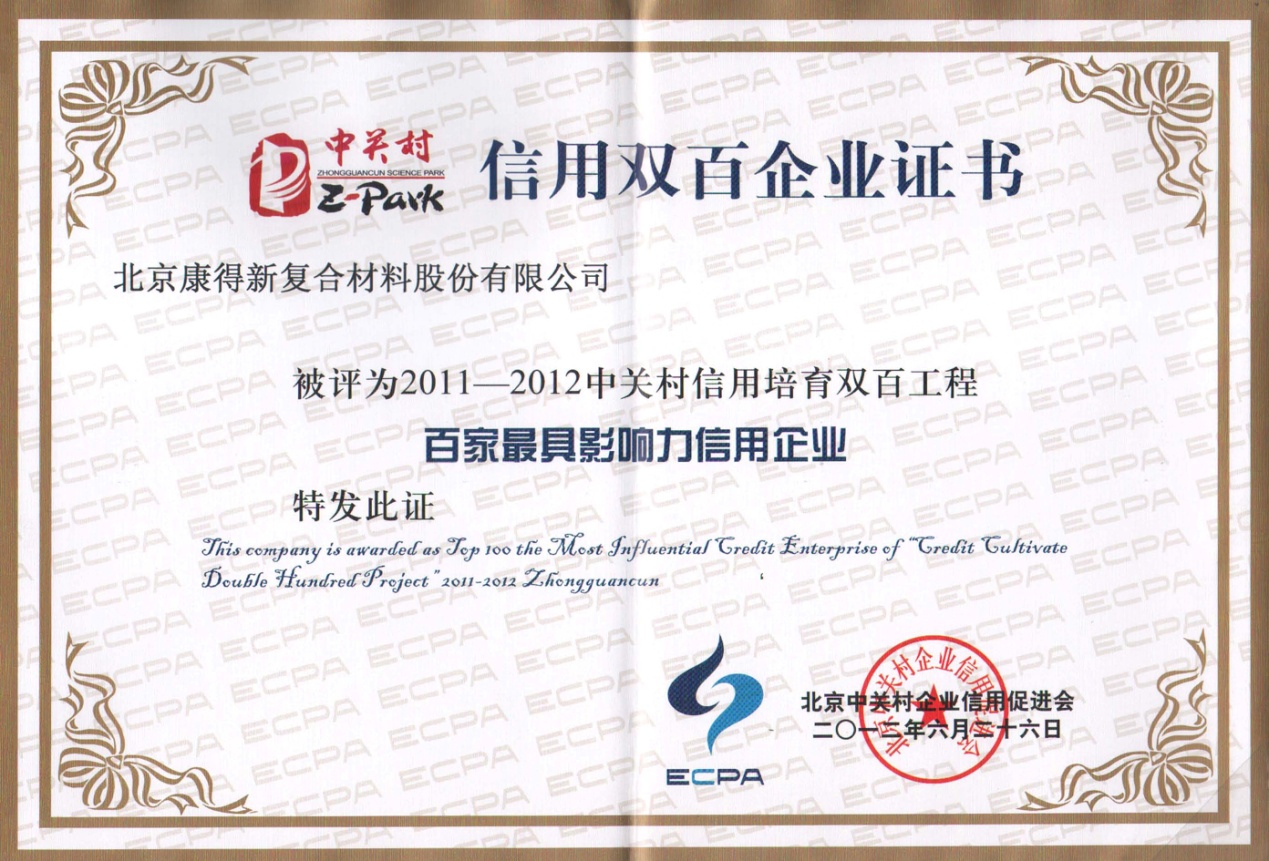 6月26日,中关村管委会、中国人民银行营业管理部、北京市经济和信息化委员会在北京世纪金源大饭店联合举办 “信用中关村”系列活动暨2012中关村信用双百企业表彰大会。康得新公司被评为2011-2012年中关村信用培育双百工程 “百家最具发展潜力信用企业”,获得这一荣誉说明康得新的创新能力、行业影响力及较大的发展潜力已得到社会各界的认同。今后康得新将继续秉承 “激情、创新、和谐、共赢”的企业文化,脚踏实地、精益求精寻发展,努力实现经济、社会效益最大化,真诚回报社会、回报股东。