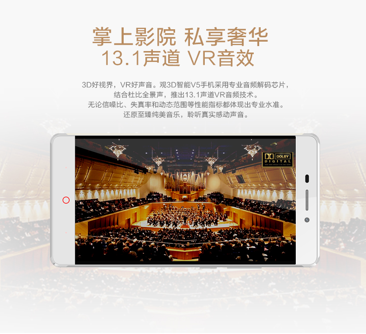 此外,观3D V5手机的另一个 “高配”就是装置了全球首发的VR音效软件,采用13.1声道的音响技术开创中国智能手机市场的先河。康得新结合杜比全景声,推出自己13.1声道VR音频技术,使其左中右三个声道的频率范围可达到20-20000Hz,能满足全音域要求。不同于通常的立体声(5.1声道),13.1声道更具有代入感,当你戴上具备显示全音域要求的康得新VR音效耳机,从听觉上就能感觉与 “女神”零距离。