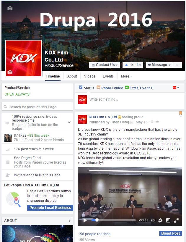 Drupa 2016,KDX集团在展会上展出了近年来为全球印刷包装行业和数字化产品应用领域开发的全系列数码膜、特种膜、装饰膜、数字3D高清图像、3D手机/PAD、3D电视、3D广告机、大屏触控等智能显示系列产品,受到了世界各地观众的广泛关注。