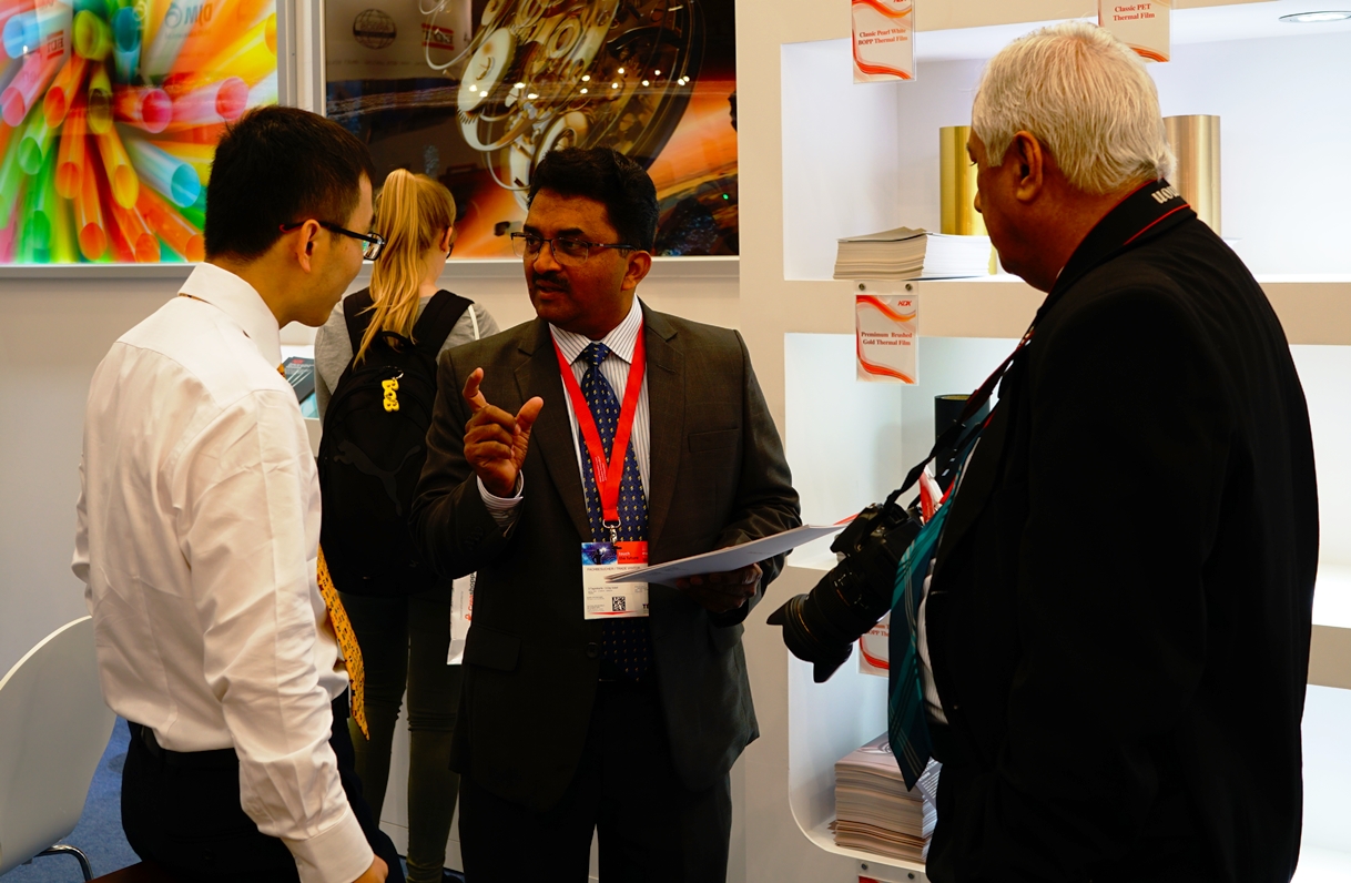DX集团营销经理与访客洽谈预涂膜及光栅膜产品合作