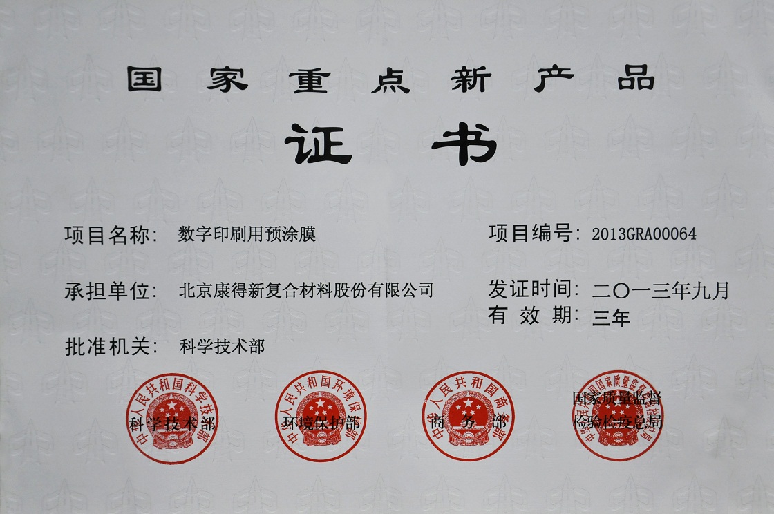 近日,国家科技部发布了《关于下达2013年度有关国家科技项目的通知》(国科发计〔2013〕571号文件),我公司 “数字印刷用预涂膜”被列入2013年度国家重点新产品计划项目。